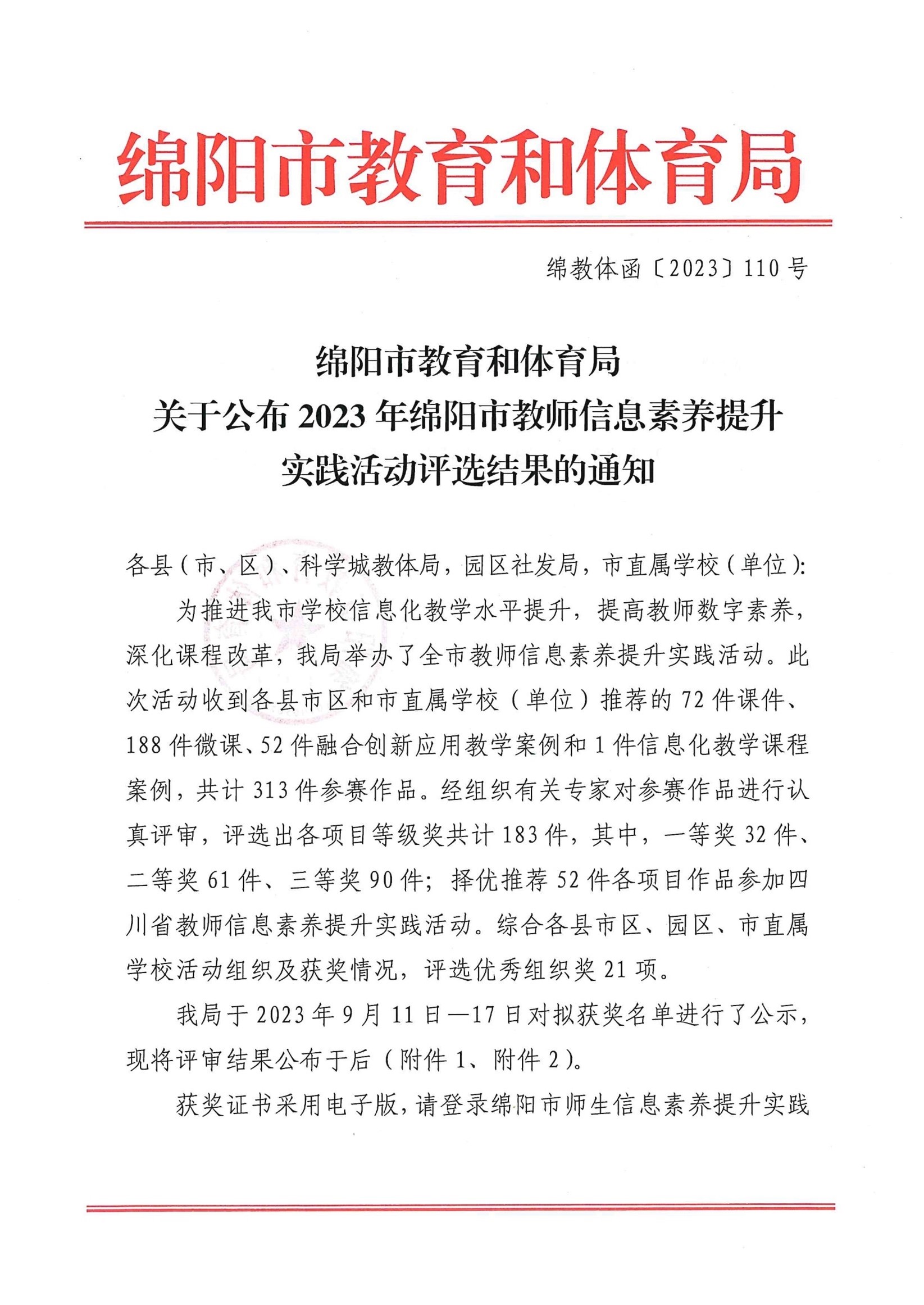 绵阳市教育和体育局关于公布2023年绵阳市教师信息素养提升实践活动评选结果的通知.pdf (1.36M)