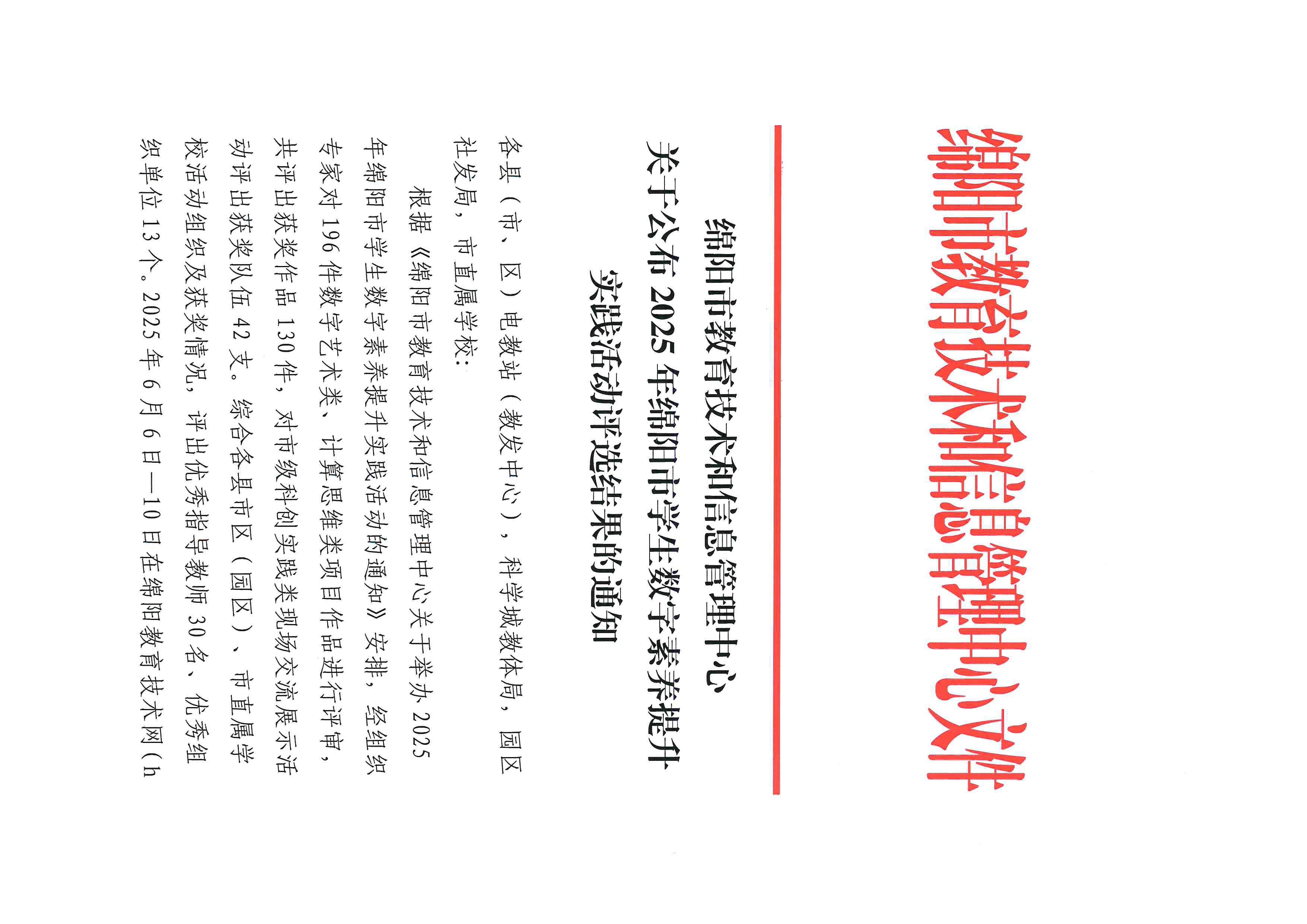 绵阳市教育技术和信息管理中心关于公布2025年绵阳市学生数字素养提升实践活动评选结果的通知