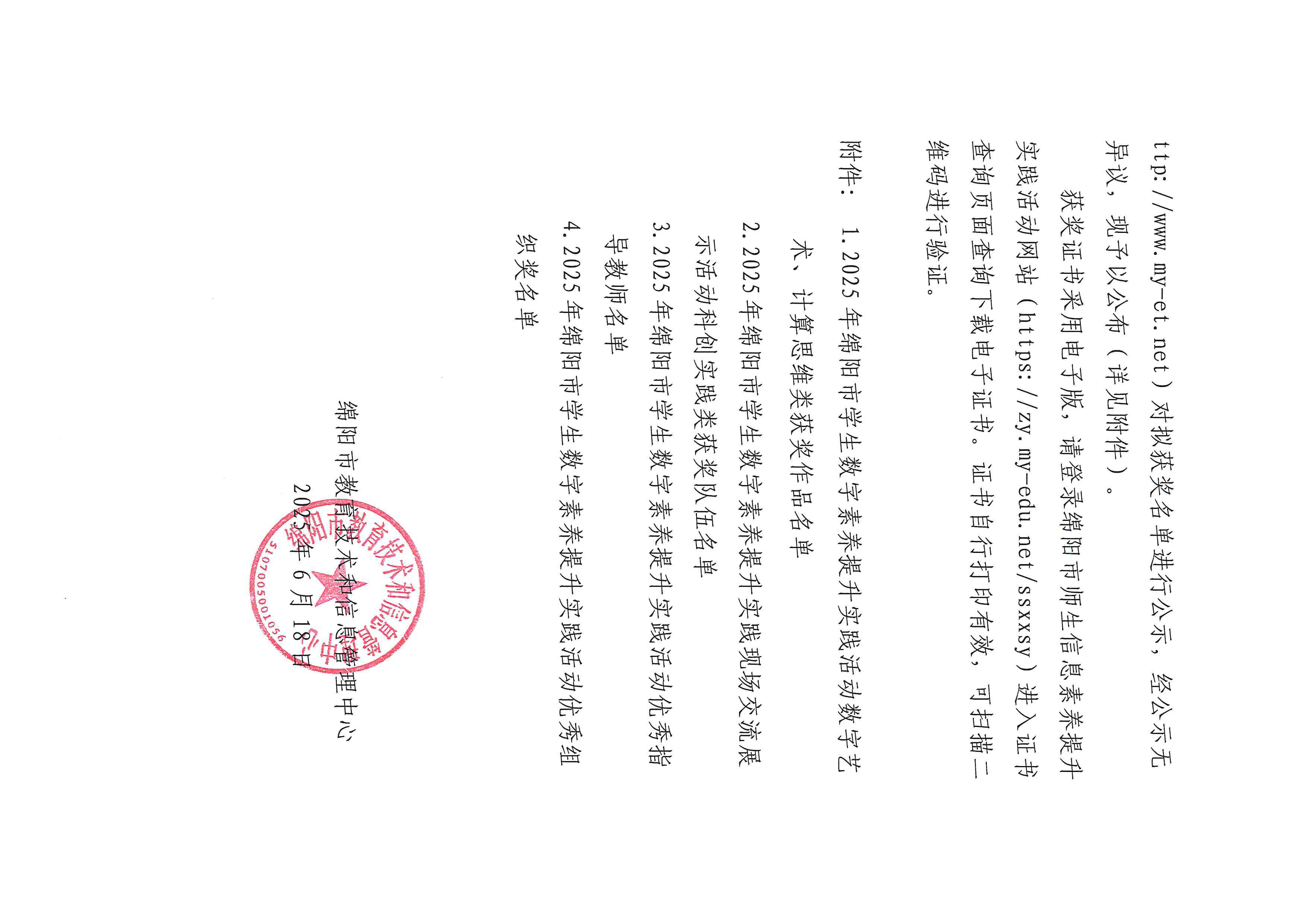 >>绵阳市教育技术和信息管理中心关于公布2025年绵阳市学生数字素养提升实践活动评选结果的通知